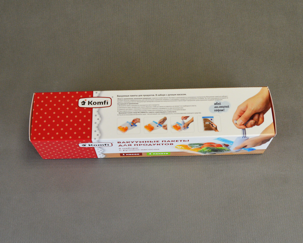 Вакуумные пакеты в наборе с ручным насосом предназначены для хранения пищевых и непищевых продуктов в домашних условиях. За счет откачивания воздуха из пакета с помощью насоса-вакууматора замедляется развитие микроорганизмов и происходит продление срока хранения пищевой продукции. Пакеты подходят для хранения и заморозки продуктов.