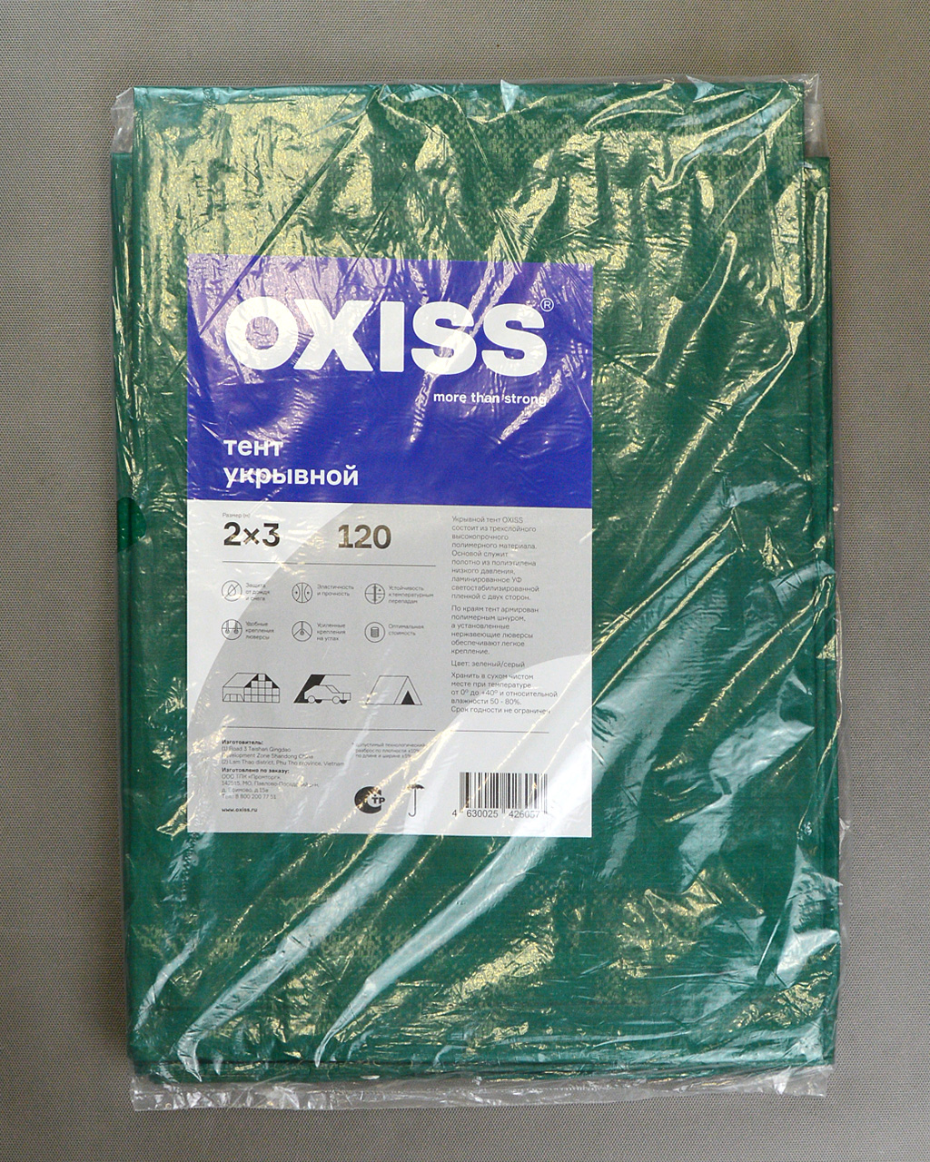 Универсальный укрывной тент «OXISS» - это долговечное полиэтиленовое полотно из трехслойного высокопрочного полимерного материала. Края изделия дополнительно укреплены плотным полимерным шнуром во избежание деформации при натяжении, а установленные нержавеющие люверсы обеспечивают легкое крепление при помощи обычных веревок или жгутов.